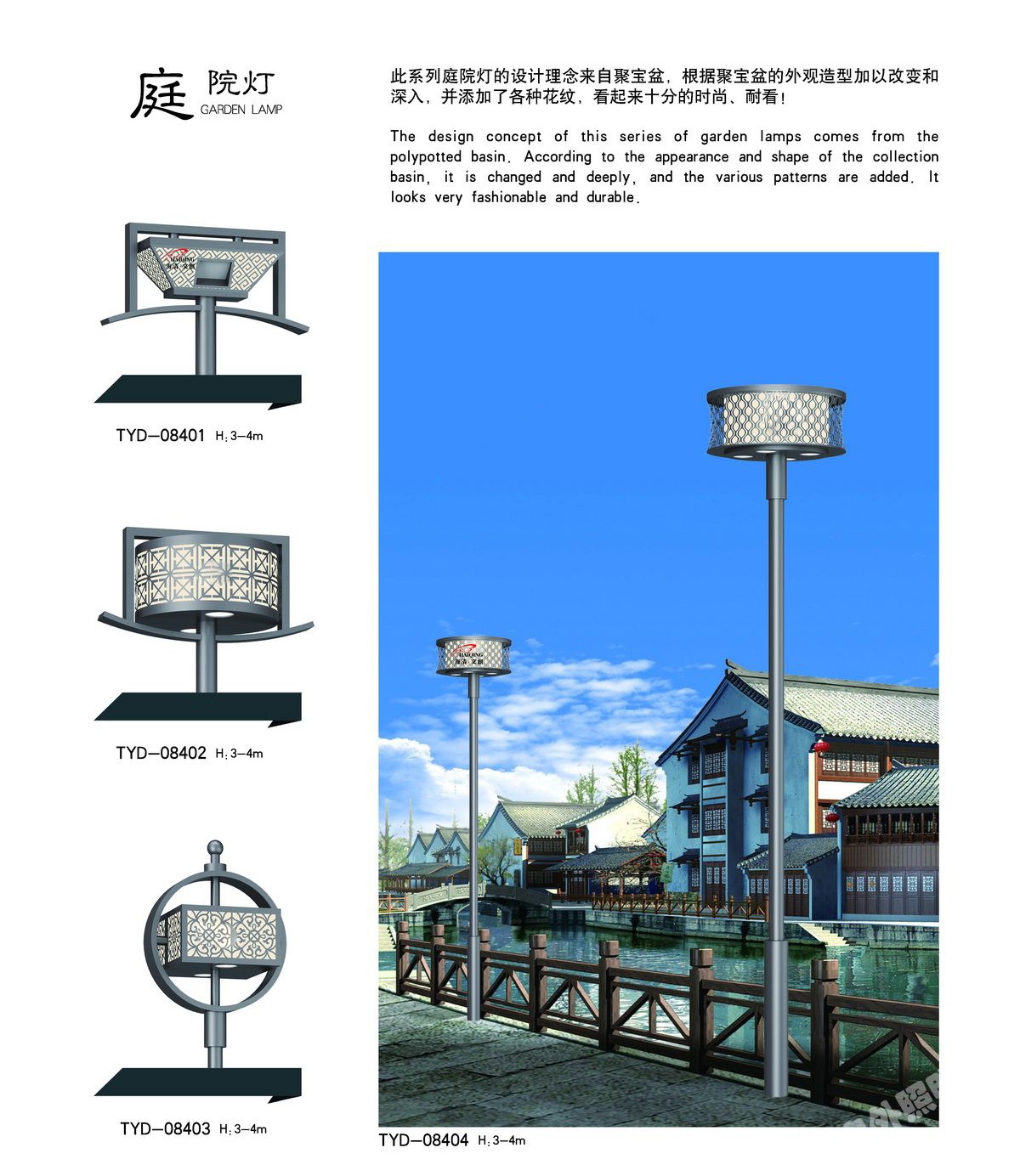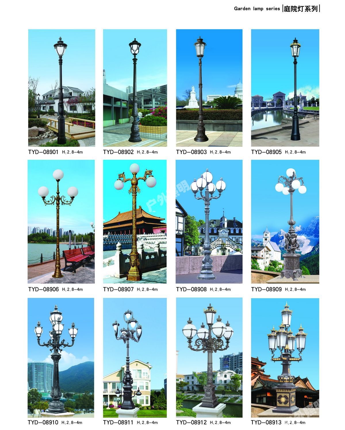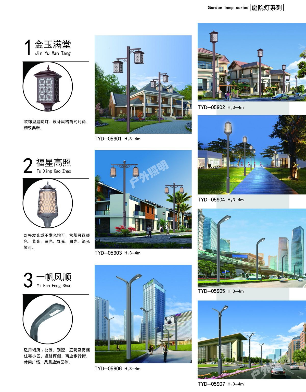 庭院燈其具有多樣性、美觀性具有美化和裝飾環(huán)境的特點,所以也被稱之為景觀庭院燈。主要應(yīng)用于城市慢車道、窄車道、居民小區(qū)、旅游景區(qū),公園、廣場等公共場所的室外照明,能夠延長人們的戶外活動的時間,提高財產(chǎn)的安全。